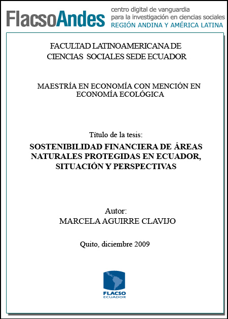 Aguirre Clavijo, Marcela (2009). Sostenibilidad financiera de áreas naturales protegidas en Ecuador, situación y perspectivas. Maestría en Economía con mención en Economía Ecológica. FLACSO, Sede Ecuador. Quito. 105 p.