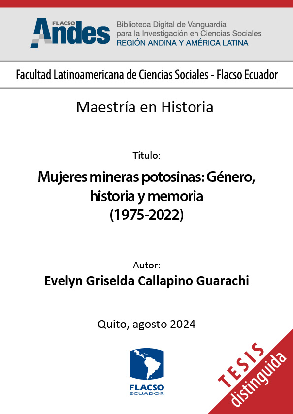 Callapino Guarachi, Evelyn Griselda. 2024. Mujeres mineras potosinas: Género, historia y memoria (1975-2022). Tesis de maestría, Flacso Ecuador.