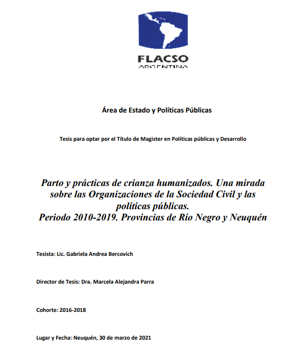 Bercovich, Gabriela Andrea. (2021). Parto y prácticas de crianza humanizados : una mirada sobre las Organizaciones de la Sociedad Civil y las políticas públicas. Periodo 2010-2019. Provincias de Río Negro y Neuquén. Tesis de Maestría. FLACSO. Sede Académica Argentina, Buenos Aires.