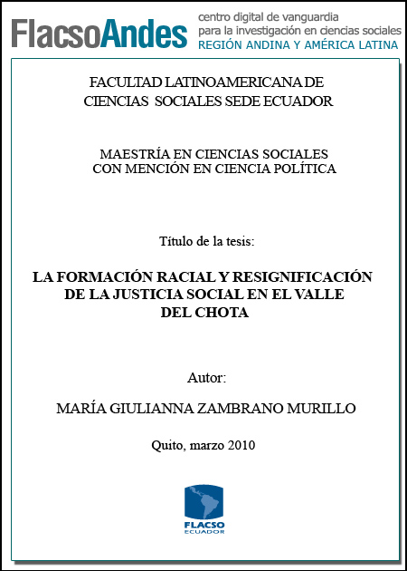 Zambrano Murillo, María Giulianna (2010). La formación racial y resignificación de la justicia social en el Valle del Chota. Maestría en Ciencias Sociales con mención en Ciencia Política; FLACSO sede Ecuador. Quito. 105 p.