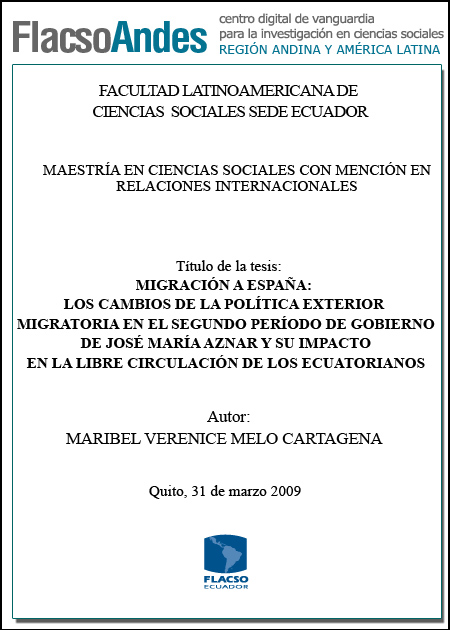 Melo Cartagena, Maribel Verenice (2009). Migración a España: los cambios de la política exterior migratoria en el segundo período de gobierno de José María Aznar y su impacto en la libre circulación de los ecuatorianos. Maestría en Ciencias Sociales con mención en Relaciones Internacionales; FLACSO sede Ecuador. Quito. 124 p.