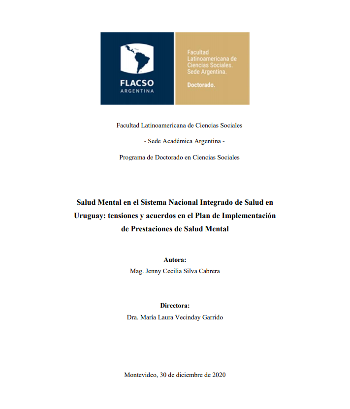 Silva Cabrera, Jenny Cecilia. (2020). Salud mental en el Sistema Nacional Integrado de Salud en Uruguay : tensiones y acuerdos en el plan de implementación de prestaciones de salud mental. Tesis de Doctorado. FLACSO. Sede Académica Argentina, Buenos Aires.