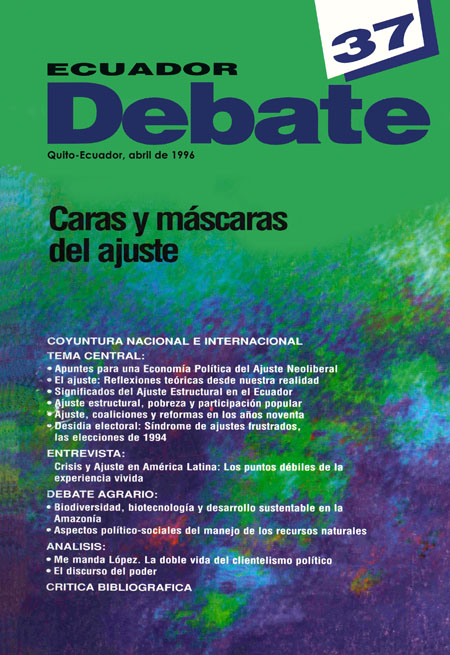 Ecuador Debate. Caras y máscaras del ajuste. Centro Andino de Acción Popular. Quito: CAAP, (no. 37, abril 1996): 241 p. ISSN: 1012-1498