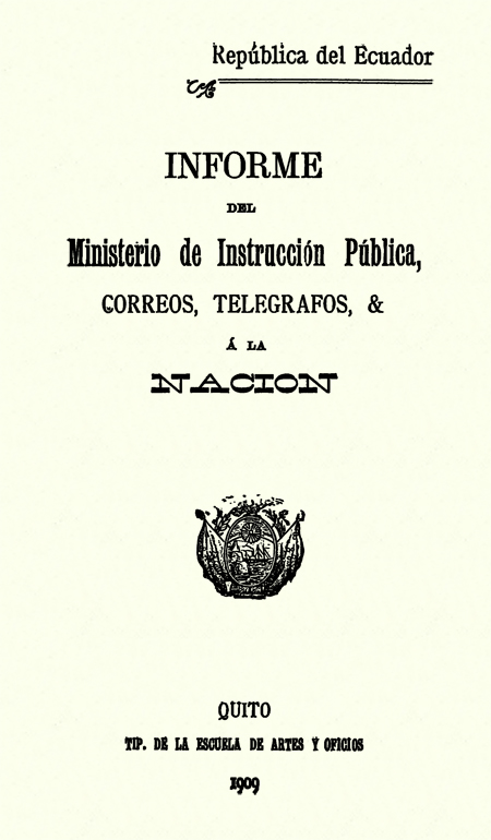 Ministerio de Instrucción Pública. 1909. Informe del Ministerio de Instrucción Pública, Correos, Telégrafos, & a la Nación. Quito, Ecuador : Tip. de la Escuela de Artes y Oficios.