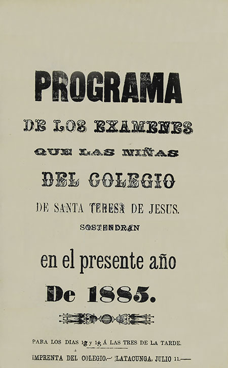 Colegio de Santa Teresa de Jesús. 1885. Programa de los exámenes que las niñas del Colegio de Santa Teresa de Jesús, sostendrán en el presente año de 1885 : para los días 13 [12] y 14 [13]. Latacunga : Imprenta del Colegio
