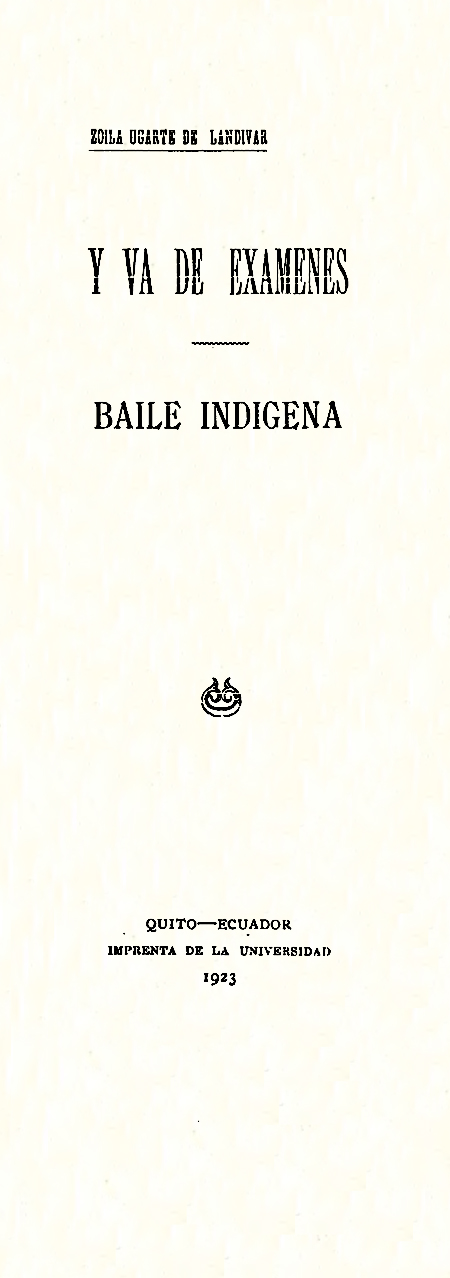 Ugarte de Landívar, Zoila. 1923. Y va de exámenes. Baile Indígena. Quito, Ecuador : Imprenta de la Universidad.