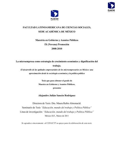 Sancén Rodríguez, Alejandro Julián (2011). La microempresa como estrategia de crecimiento económico y dignificación del trabajo : el desarrollo de las aptitudes empresariales de los microempresarios en México : una aproximación desde la sociología económica y la política pública. Maestría en Gobierno y Asuntos Públicos; FLACSO México. México. 103 h.