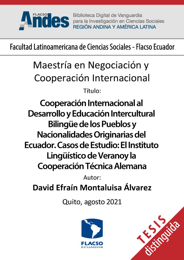 Montaluisa Álvarez, David Efraín. 2021. Cooperación Internacional al Desarrollo y Educación Intercultural Bilingüe de los Pueblos y Nacionalidades Originarias del Ecuador. Casos de Estudio: El Instituto Lingüístico de Verano y la Cooperación Técnica Alemana. Tesis de maestría, Flacso Ecuador.