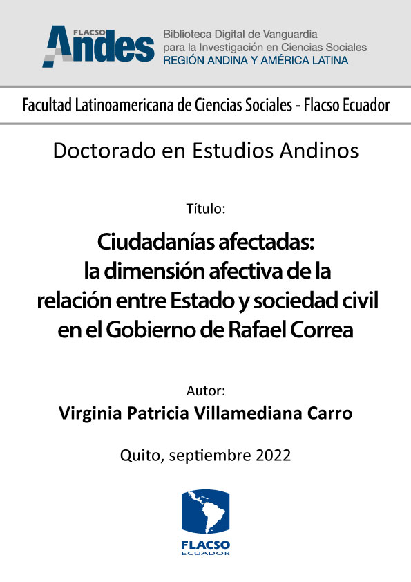 Villamediana Carro, Virginia Patricia. 2022. Ciudadanías afectadas: la dimensión afectiva de la relación entre Estado y sociedad civil en el Gobierno de Rafael Correa. Tesis doctoral, Flacso Ecuador.