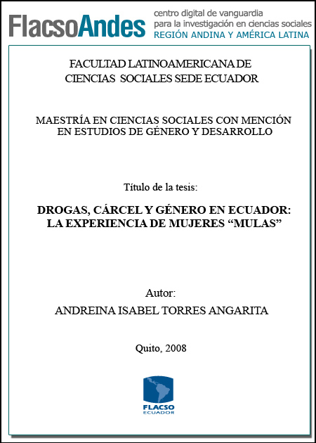 Torres Angarita, Andreina (2008). Drogas, cárcel y género en el Ecuador: la experiencia de mujeres "mulas". Maestría en Ciencias Sociales con Mención en Estudios de Género y Desarrollo, FLACSO Sede Ecuador. Quito. 135 p.