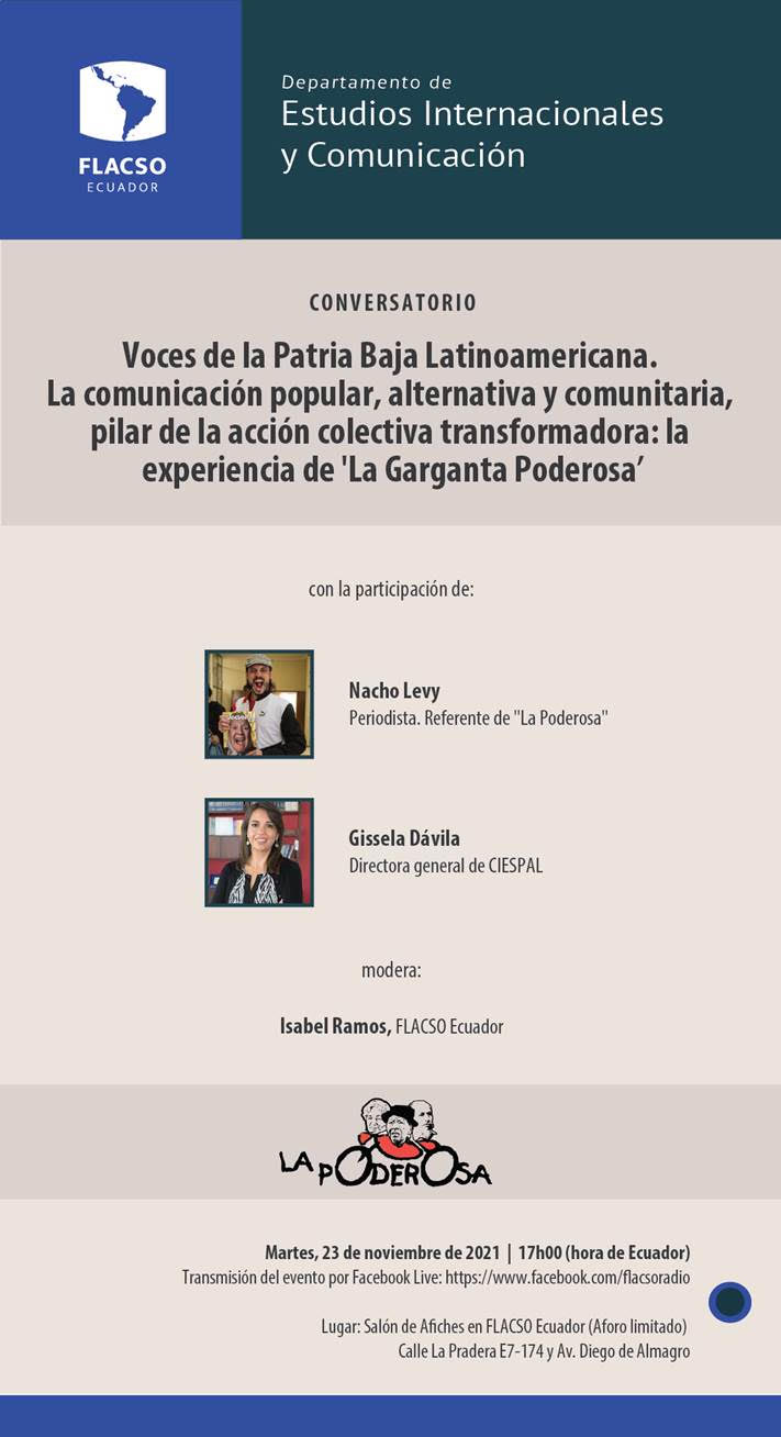 FLACSO Ecuador : Estudios Internacionales y Comunicación – Conversatorio Voces de la Patria Baja Latinoamericana. La comunicación popular, alternativa y comunitaria, pilas de la acción colectiva transformadora: la experiencia de "La Garganta Poderosa", 23 de noviembre de 2021 - 17:00 – 18:30 - FLACSO Ecuador, Quito. Con la participación de Nacho Levy (Periodista. Referente de “La Poderosa”) y Gissela Dávila (Directora general de CIESPAL).