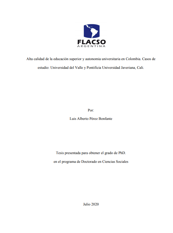 Pérez Bonfante, Luis Alberto. (2020). Alta calidad de la educación superior y autonomia universitaria en Colombia : casos de estudio : Universidad del Valle y Pontificia Universidad Javeriana, Cali. Tesis de Doctorado. FLACSO. Sede Académica Argentina, Buenos Aires.