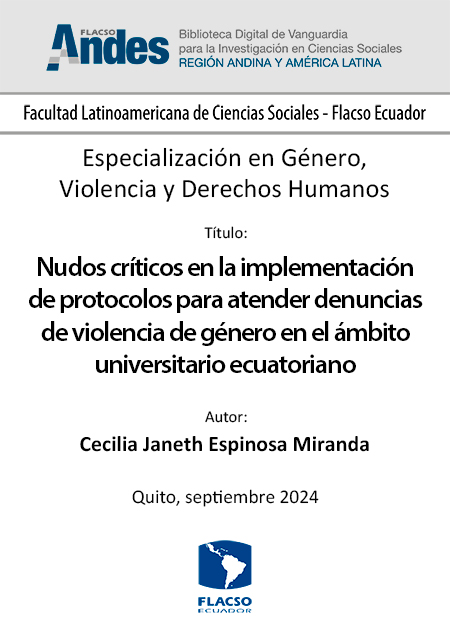 Espinosa Miranda, Cecilia Janeth. 2024. Nudos críticos en la implementación de protocolos para atender denuncias de violencia de género en el ámbito universitario ecuatoriano. Tesina de especialización, Flacso Ecuador.