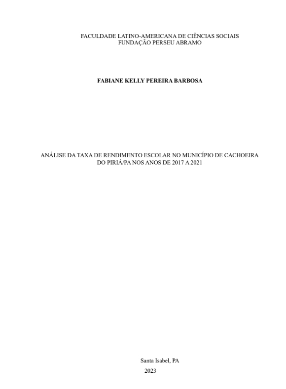 Kelly Pereira Barbosa, Fabiane. 2023. Análise da taxa de rendimento escolar no Município de Cachoeira do Piriá/PA nos anos de 2017 a 2021. Tesis de maestría, Flacso Brasil.