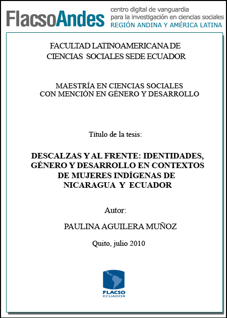 Aguilera Muñoz, Paulina (2010). Descalzas y al frente : identidades, género y desarrollo en contextos de mujeres indígenas de Nicaragua y Ecuador. Maestría en Ciencias Sociales con mención en Género y Desarrollo; FLACSO - Sede Ecuador. Quito. 171 p.