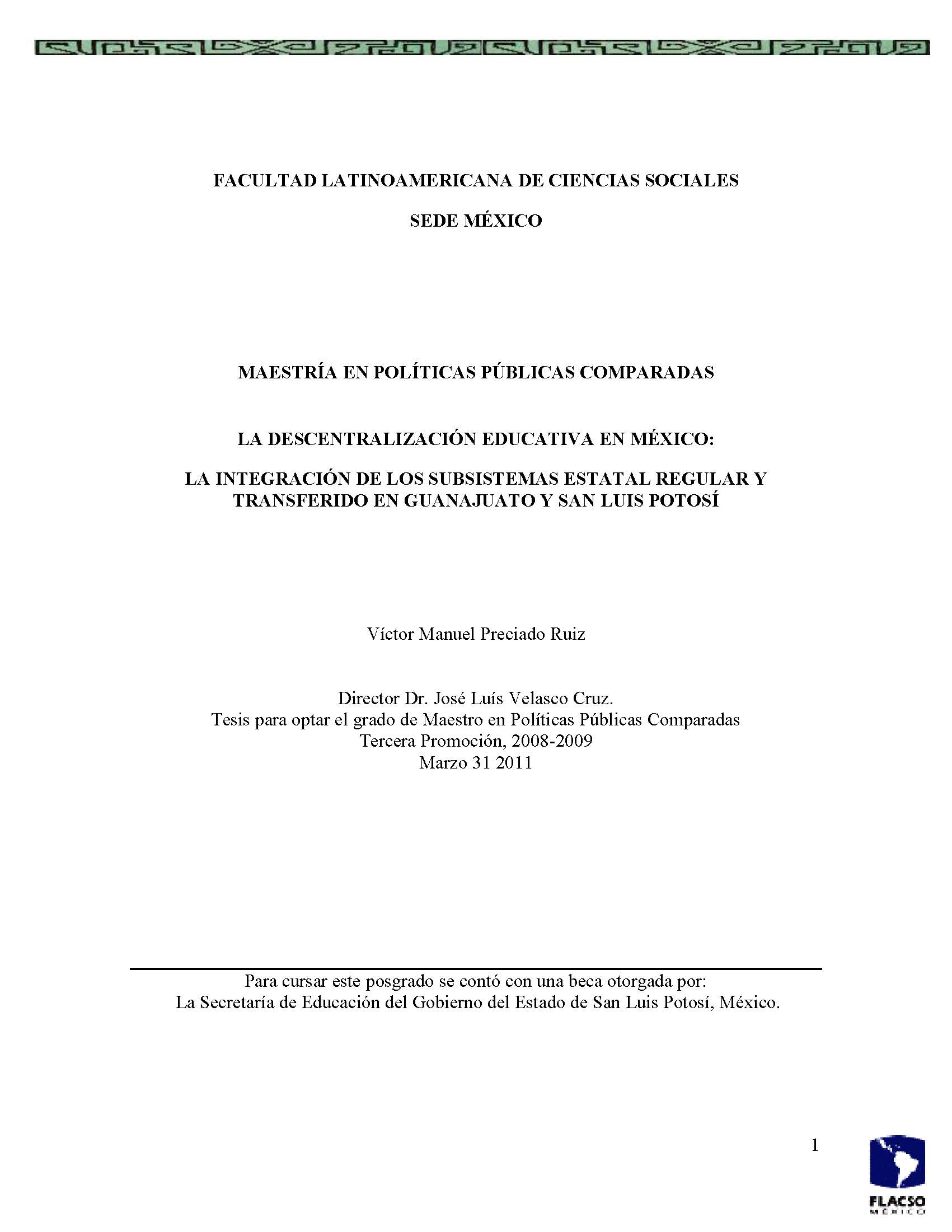 Preciado Ruiz, Víctor Manuel (2011). La descentralización educativa en México : la integración de los subsistemas estatal regular y transferido en Guanajuato y San Luis Potosí. Maestría en Políticas Públicas Comparadas; FLACSO México. México. 73 h.