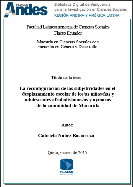 Núñez Bacarreza, Gabriela. 2015. La reconfiguración de las subjetividades en el desplazamiento escolar de los/as niños/as y adolescentes afrobolivianos/as y Aymaras de la comunidad de Mururata. Tesis de maestría, Flacso Ecuador.