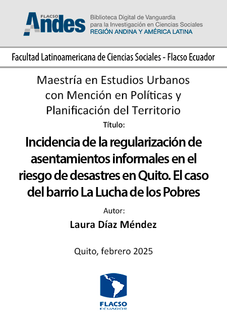 | dc.identifier.citation | Díaz Méndez, Laura. 2025. Incidencia de la regularización de asentamientos informales en el riesgo de desastres en Quito. El caso del barrio La Lucha de los Pobres. Tesis de maestría, Flacso Ecuador. | es_ES |