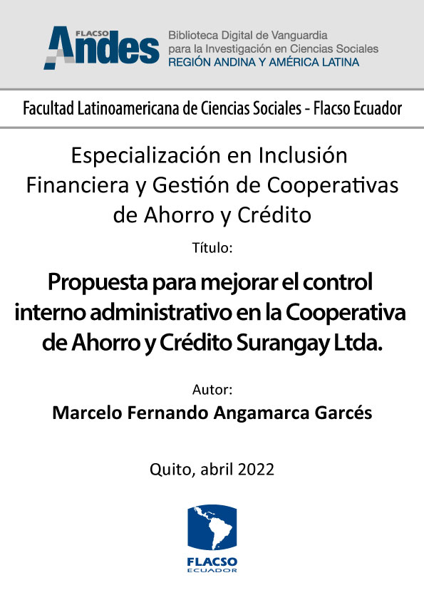 Angamarca Garcés, Marcelo Fernando. 2022. Propuesta para mejorar el control interno administrativo en la Cooperativa de Ahorro y Crédito Surangay Ltda. Tesina de especialización, Flacso Ecuador.