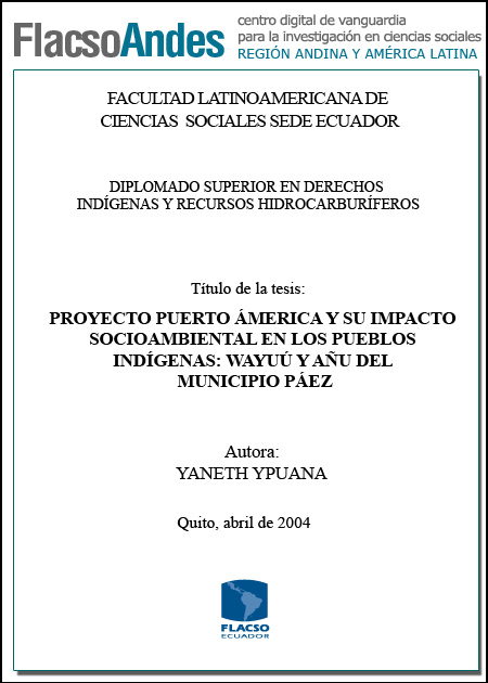 Ypuana González, Yaneth Silvia (2004). Proyecto Puerto América y su impacto socioambiental en los pueblos indígenas Wayuu y Añu del Municipio Paez. Diplomado Superior en Derechos Indígenas y Recursos Hidrocarburíferos; FLACSO - Sede Ecuador. Quito. 60 p.