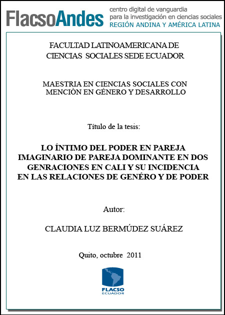 Bermúdez Suárez, Claudia Luz. 2011. Lo íntimo del poder en pareja: imaginario de pareja dominante en dos generaciones en Cali y su incidencia en las relaciones de género y de poder. Tesis de maestría, Flacso Ecuador.