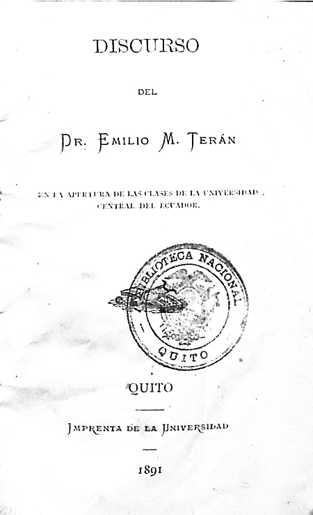 Terán, Emilio María. 1891. Discurso del Dr. Emilio M. Terán en la apertura de las clases de la Universidad Central del Ecuador. Quito, Ecuador : Imprenta de la Universidad.