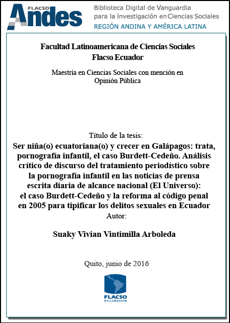 Ser niña(o) ecuatoriana(o) y crecer en Galápagos: trata, pornografía infantil, el caso Burdett-Cedeño. Análisis crítico de discurso del tratamiento periodístico sobre la pornografía infantil en las noticias de prensa escrita diaria de alcance nacional (El Universo): el caso Burdett-Cedeño y la reforma al código penal en 2005 para tipificar los delitos sexuales en Ecuador.