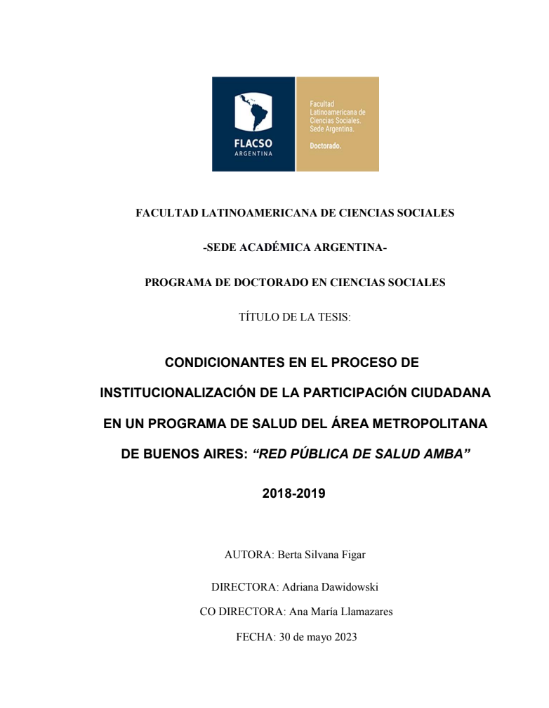 Figar, Berta Silvana (2023). Condicionantes en el proceso de institucionalización de la participación ciudadana en un programa de salud del área metropolitana de Buenos Aires: "Red Pública de Salud AMBA” 2018-2019. Tesis de Doctorado. FLACSO. Sede Académica Argentina, Buenos Aires.