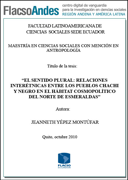 Yépez Montufar, Jeanneth (2010). El sentido plural : relaciones interétnicas entre los pueblos chachi y negro en el hábitat cosmopolítico del norte de Esmeraldas . Maestría en Ciencias Sociales con mención en Antropología, FLACSO Sede Ecuador. Quito. 160 p.
