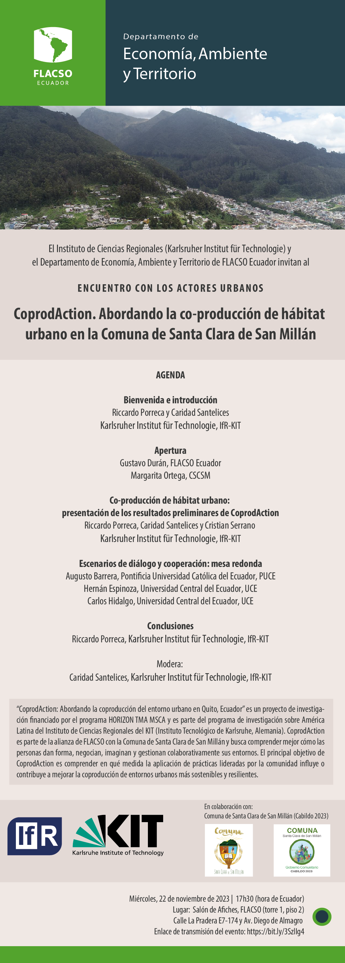 El Departamento de Economía, Ambiente y Territorio y el Instituto de Ciencias Regionales (Karlsruher Institut für Technologie) y el Departamento de Economía, Ambiente y Territorio de FLACSO Ecuador invitan al encuentro con los actores urbanos "CoprodAction. Abordando la co-producción de hábitat urbano en la Comuna de Santa Clara de San Millán". Con la participación de Ricardo Porreca, Hernán Espinoza, Carlos Hidalgo, Augusto Barrera, Caridad Santelices y Cristian Serrano, el miércoles 22 de noviembre de 2023 a las 17h30 (hora Ecuador) : FLACSO Ecuador, Quito.