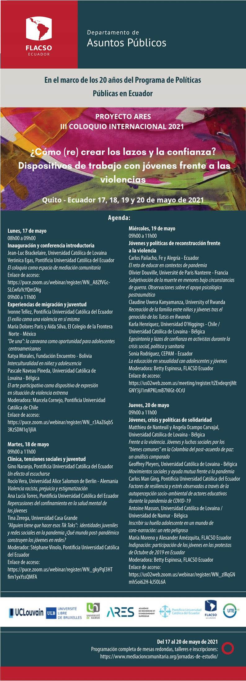 FLACSO Ecuador : Políticas Públicas – Proyecto Ares III Coloquio Internacional 2021 ¿Cómo (re) crear los lazos y la confianza? Dispositivos de trabajo con jóvenes frente a las violencias, 17 de mayo de 2021 - 09:00 - 11:00 - FLACSO Ecuador, Quito. En el marco de los 20 años del Programa de Políticas Públicas en Ecuador.