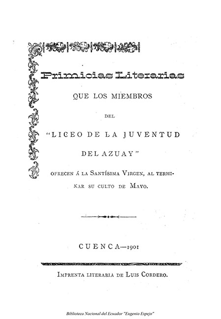 Liceo de la Juventud del Azuay. 1901. Primicias literarias que los miembros del Liceo de la Juventud del Azuay ofrecen a la Santísima Virgen, al terminar su culto de Mayo. Quito : Imprenta Literaria de Luis cordero.