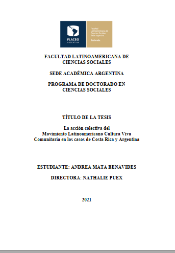 Mata Benavides, Andrea. (2021). La acción colectiva del movimiento latinoamericano cultura viva comunitaria en los casos de Costa Rica y Argentina. Tesis de Doctorado. FLACSO. Sede Académica Argentina, Buenos Aires.