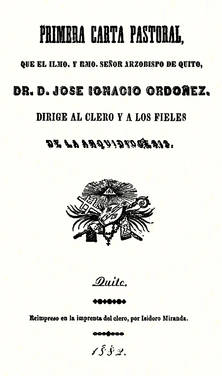 Primera carta pastoral, que el Ilmo. y Rmo. Señor Arzobispo de Quito Dr. D. José Ignacio Ordoñez, dirige al clero y a los fieles de la Arquidiócesis (Folleto).