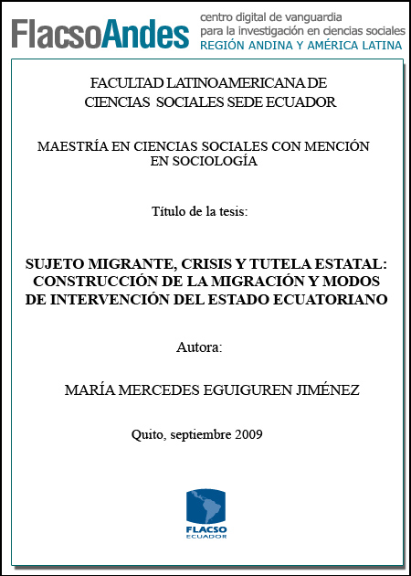 Eguiguren Jiménez, María Mercedes (2010). Sujeto migrante, crisis y tutela estatal : construcción de la migración y modos de intervención del estado ecuatoriano. Maestría en Ciencias Sociales con mención en Sociología; FLACSO - Sede Ecuador. Quito. 157 p.