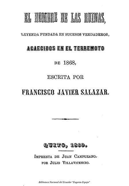Salazar, Francisco Javier. 1869. El hombre de las ruinas, leyenda fundada en sucesos verdaderos, acaecidos en el terremoto de 1868. Quito : Imprenta de Juan Campuzano.