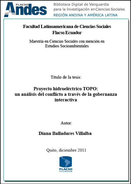 Balladares Villalba, Diana. 2011. Proyecto hidroeléctrico TOPO : un análisis del conflicto a través de la gobernanza interactiva. Tesis de maestría, Flacso Ecuador.