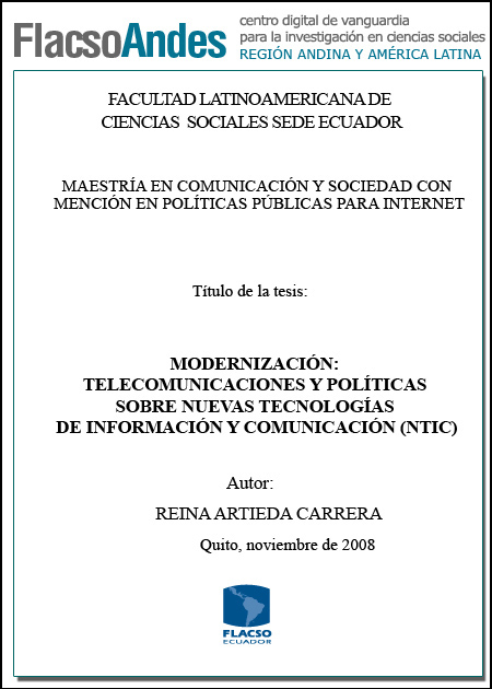 Artieda Carrera, Reina (2008). Modernización: telecomunicaciones y políticas sobre nuevas tecnologías de información y comunicación. Maestría en Comunicación. FLACSO, Sede Ecuador. Quito. 228 p.