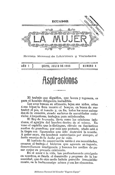 Ugarte de Landívar, Zoila, Carolina Febres Cordero de Arévalo, Mercedes González de Moscoso, Delia C. de González, María Natalia Vaca, Lastenia Lasrive de Llona, Isabel Donoso de Espinel, Rosario Carrión Burneo y Joselina Veintemil. 1905. La mujer : Revista mensual de literatura y variedades 1 (4) . Quito : Imprenta de la Sociedad Gutenberg.