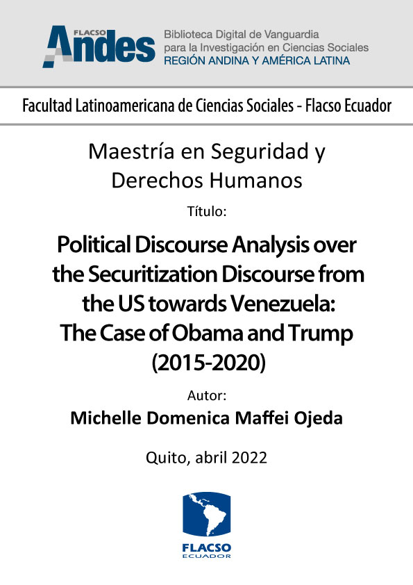 Maffei Ojeda, Michelle Domenica. 2022. Political Discourse Analysis over the Securitization Discourse from the US towards Venezuela: The Case of Obama and Trump (2015-2020). Tesis de maestría, Flacso Ecuador.