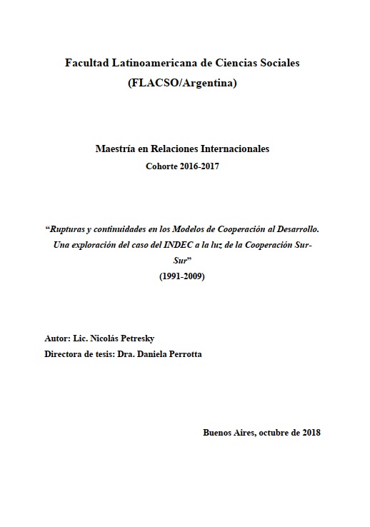 Petresky, Nicolás (2018). Rupturas y continuidades en los modelos de cooperación al desarrollo : una exploración del caso del INDEC a la luz de la cooperación sur - sur (1991-2009). Tesis de Maestría. FLACSO. Sede Académica Argentina, Buenos Aires.
