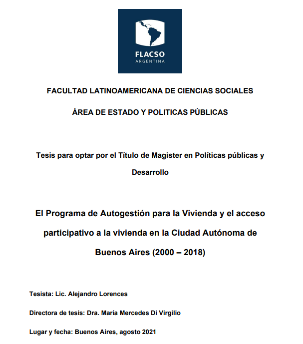 Lorences, Alejandro Gabriel. (2021). El Programa de Autogestión para la Vivienda y el acceso participativo a la vivienda en la Ciudad Autónoma de Buenos Aires (2000–2018). Tesis de Maestría. FLACSO. Sede Académica Argentina, Buenos Aires.