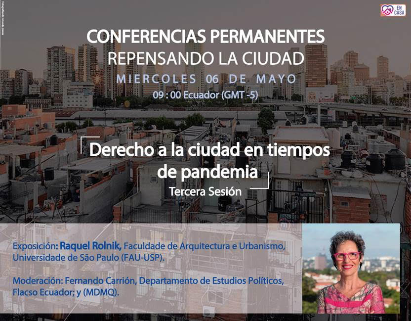 Rolnik, Raquel. 2020. Derecho a la ciudad en tiempos de pandemia: tercera sesión. FLACSO Ecuador, 06 de mayo, archivo en MP4, 00:29:49