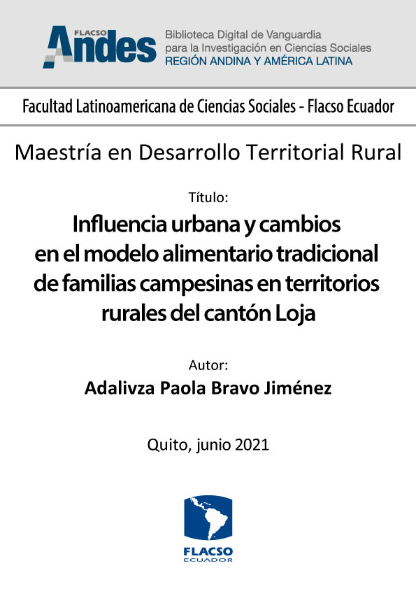 Bravo Jiménez, Adalivza Paola. 2021. Influencia urbana y cambios en el modelo alimentario tradicional de familias campesinas en territorios rurales del cantón Loja. Tesis de maestría, Flacso Ecuador.