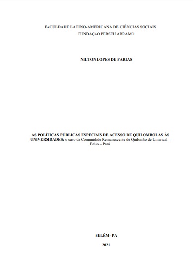 Lopes da Farias, Nilton. 2021. AS POLÍTICAS PÚBLICAS ESPECIAIS DE ACESSO DE QUILOMBOLAS ÀS UNIVERSIDADES: o caso da Comunidade Remanescente de Quilombo de Umarizal – Baião – Pará. Tesis de maestría, Flacso Brasil.