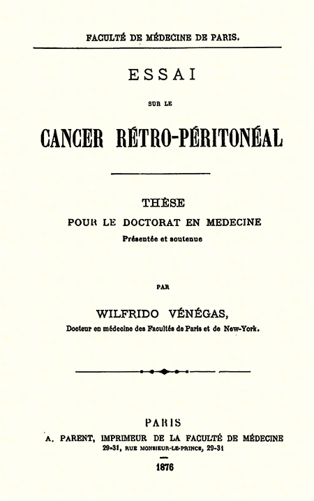Vénégas, Wilfrido. Essai sur le cancer réto-péritonéal : Thése pour le doctorat en medecine présentée et soutenue. París, Francia : A. Parent, Emprimeur de la Faculté de Médecine.