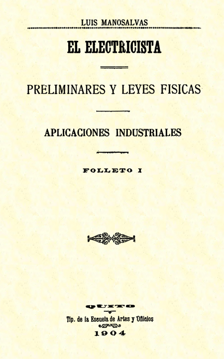 Impulsado por el deseo de facilitar el estudio de electricidad, especialmente para aquellos que no están muy versados en la física general, y deseando que la juventud Ecuatoriana pueda estar al alcance de los progresos de la ciencia, que conozca y maneje al insigne agente, y se halle apto no sólo para los varios sistemas de comunicación sino para otras varias aplicaciones industriales y electroterápicas, que pronto llegarán á nosotros y avanzarán tal vez con nosotros en vista de la aptitud cerebral que nuestra juventud manifiesta, y como el principio fundamental para el progreso es el estudio de las ciencias físicas, quiero ayudar en algo con mi pequeño contigente.