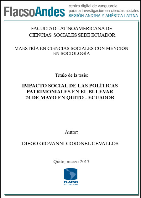 Coronel, D. G. (2013). Impacto social de las políticas patrimoniales en el Bulevar 24 de mayo en Quito - Ecuador (Tesis de Maestría en Ciencias Sociales con mención en Sociología). FLACSO Sede Ecuador, Quito.
