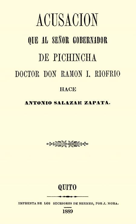 Zalazar Zapata, Antonio. 1889. Acusación que al señor gobernador de Pichincha doctor don Ramón I. Riofrío hace Antonio Salazar Zapata. Quito, Ecuador : Imprenta de los sucesores de Bermeo.