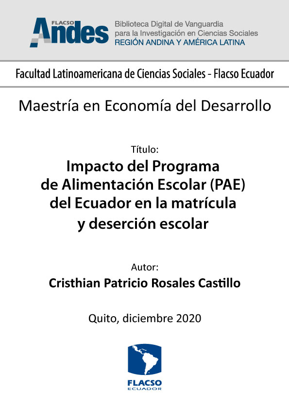 Rosales Castillo, Cristhian Patricio. 2020. Impacto del Programa de Alimentación Escolar (PAE) del Ecuador en la matrícula y deserción escolar. Tesis de maestría, Flacso Ecuador.